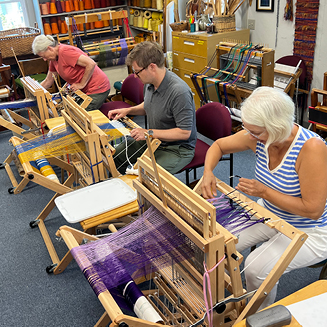 This four-day class is designed for the weaver who desires to enhance their basic skills. Emphasis will include choosing a draft and materials, enhancement of technical skills, and recognition and resolution of in-process errors. You’ll have the opportunity to design your own project, investigate different weave structures, and discover some of the endless possibilities of weaving on a 4-harness loom. The instructor will contact all students before class to discuss yarn and pattern options. Shoes must be removed while treadling on the floor looms, so please plan accordingly. Bring lunch and drink. Please NOTE: This class is the sequel to WEAVING 101. While it is not a prerequisite, students MUST be familiar with warping a loom and reading a draft.